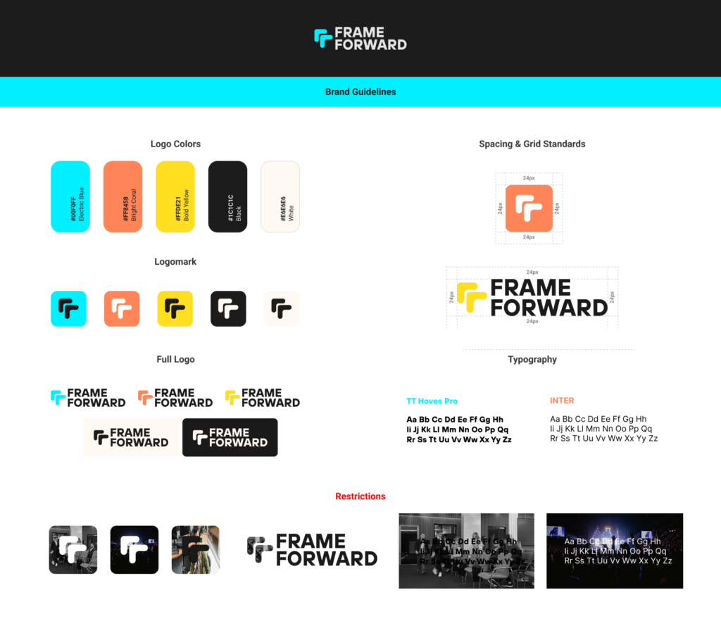 Frame Forward is a live event series concept built around energy, momentum, and community. We developed the complete brand identity from the ground up, including logo design, icon system, color palette, typography, print collateral, and social media templates. The visual identity is bold and kinetic — designed to command attention on-screen and in-person.